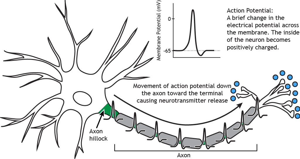 An individual neuron may appear as an all-or-nothing event, transmitting electrical current to another neuron in order to inhibit or excite it. However, prior to that transmission, the action potential, the neuron continuously receives positive and negative inputs in a region called the dendrites. If the global sum of these inputs exceeds a certain threshold, a physical conformational change occurs, and the electrical current propagates along the axon toward the next neuron. For most of the time, neuronal processing takes place below the action threshold, where excitatory and inhibitory currents are continuously integrated.