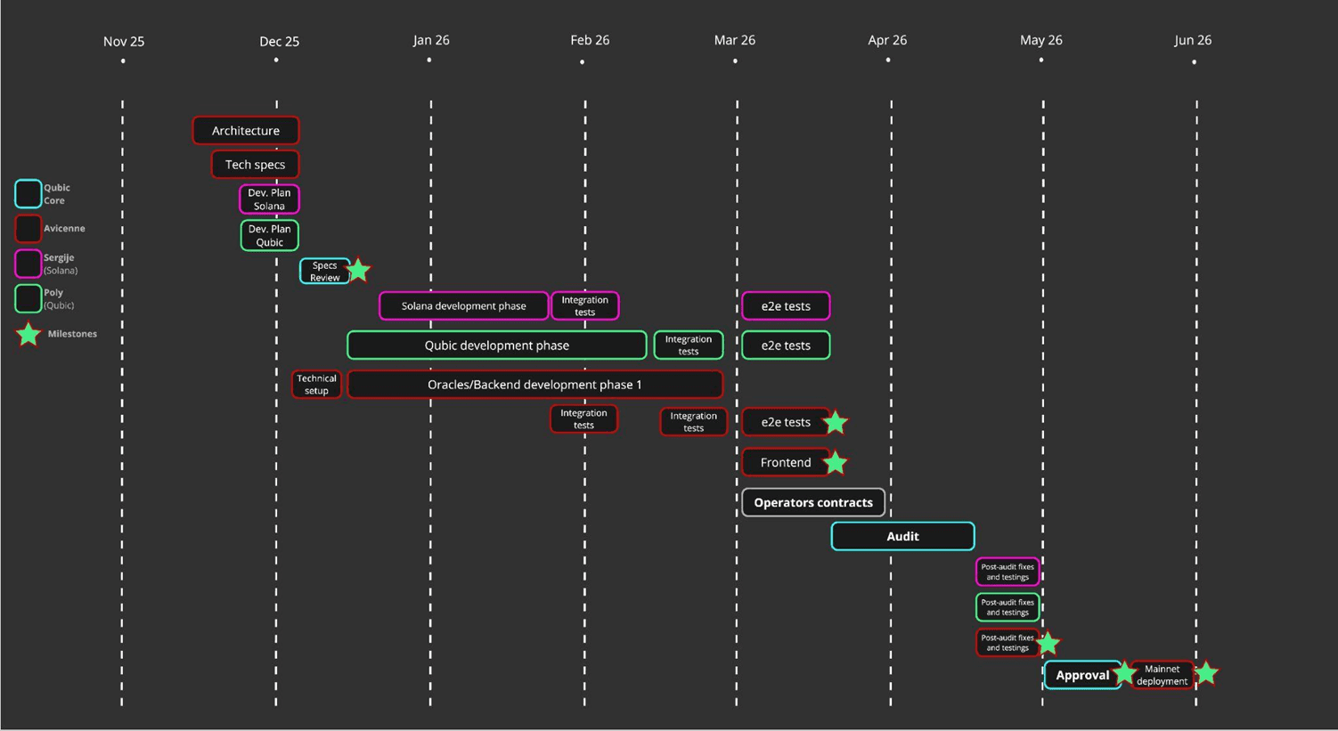 November 2025 – January 2026: Planning Phase The team finalizes the architecture, technical specifications, and development plans for both the Solana and Qubic sides. This phase concludes with a formal specifications review.