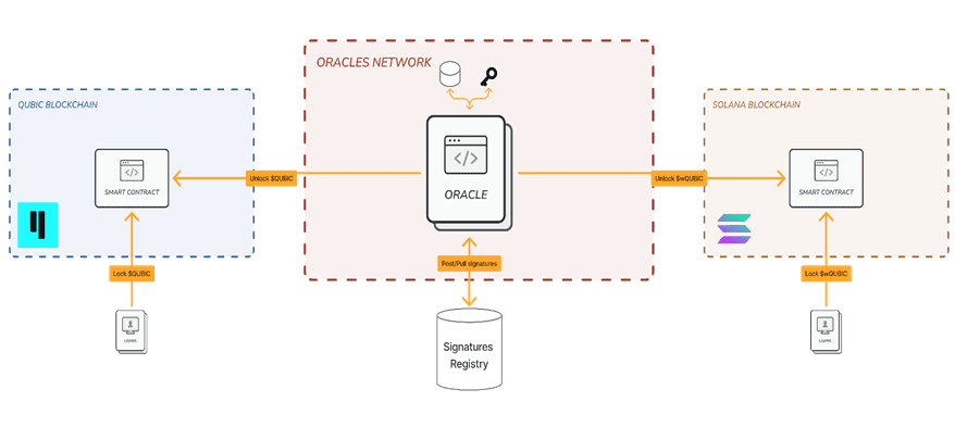 Oracles are the bridge's verification layer. The system uses six to eight independent oracles, each holding signing keys for both the Qubic and Solana chains.
