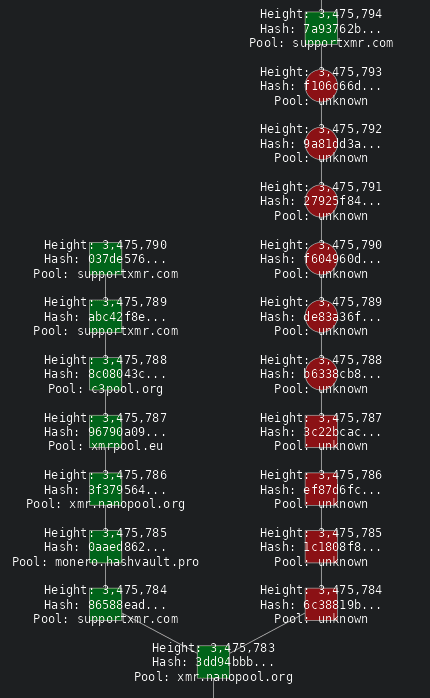 After several hours of this new strategy, orphaned blocks began to appear on the Monero network. An orphaned block is a valid block that is not part of the main, longest chain. When a miner solves a block and broadcasts it, other miners accept it and begin working on the next block. If a different miner solves a block at nearly the same time, two competing chains can form. The network ultimately accepts the longer chain, and any blocks on the shorter chain become "orphaned."